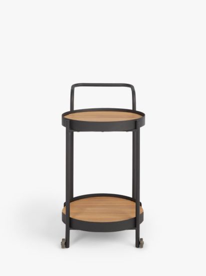 • Perfect for outdoor parties, this cart features a sturdy and weather-resistant powder-coated steel frame. The rounded top and bottom shelves are made from naturally weather-resistant FSC-certified acacia wood. This modern and sturdy design comes with two transport wheels, so it's easy to pull it up to the garden table, ready for happy hours and sunset views.