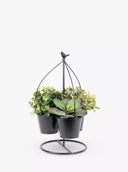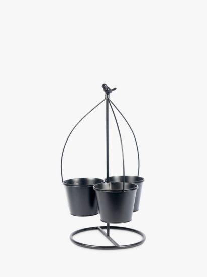 • Made of iron, it's a cross between a hanging basket and a set of three separate pots, with a cute garden bird sitting on top.